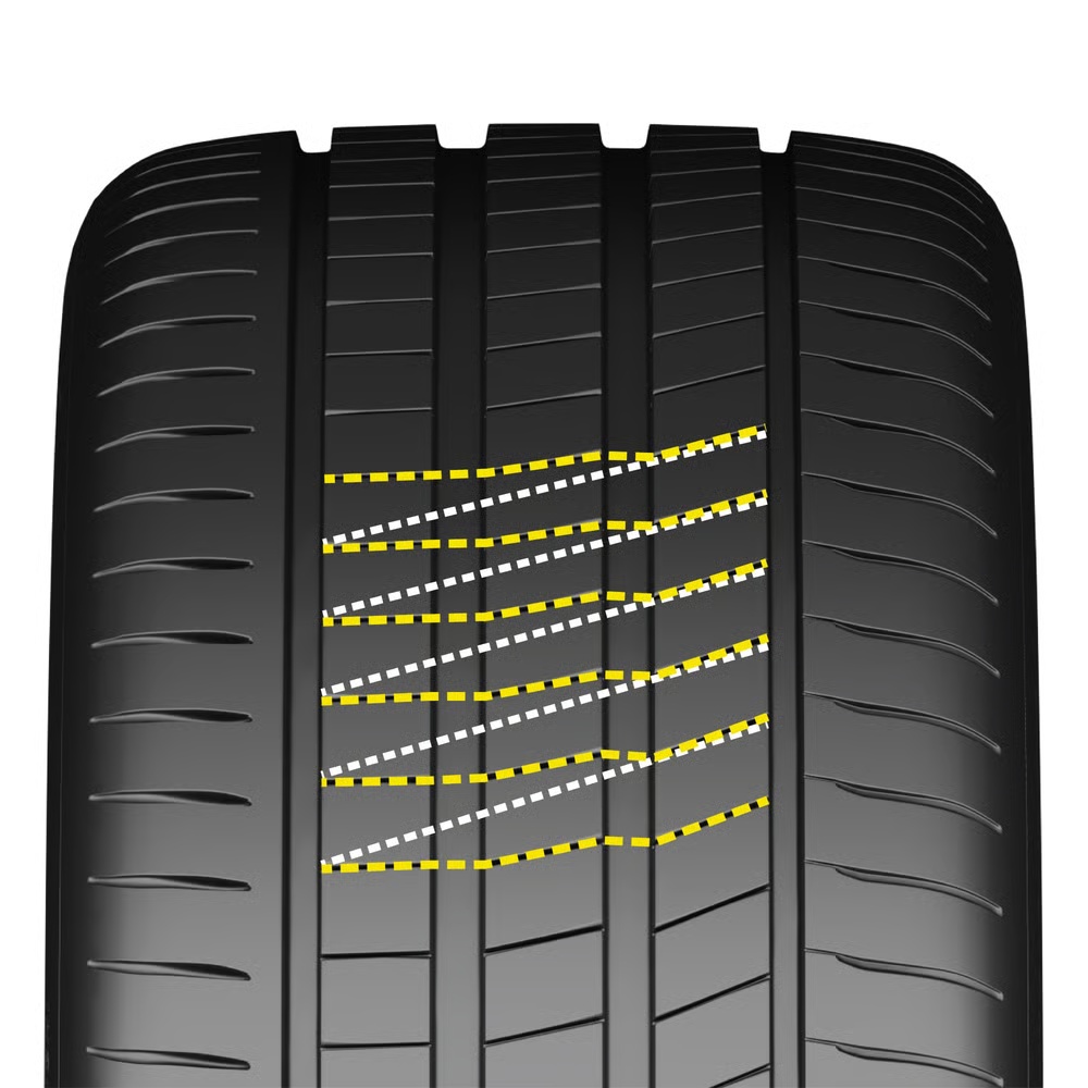 Канавки протектора спроектированы с учетом оптимизированной пропускной способности: вода отводится из пятна контакта быстро и по нескольким траекториям одновременно. Скошенные сегменты дополнительно направляют жидкость вдоль траншей, предотвращая образование водной пленки между резиной и асфальтом. Тормозное зацепление на влажной дороге остается высоким даже при интенсивных осадках — именно этот показатель наиболее критичен для безопасности в ежедневных поездках. Модель разрабатывалась под реальные дорожные сценарии, где дождь застает врасплох, а дистанция торможения должна оставаться предсказуемой.